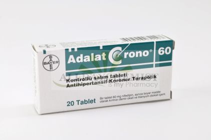 Adalat Chrono 60 mg is prescribed for the treatment of hypertension (high blood pressure) and angina (chest pain). The active ingredient of the medicine is Nifedipine a known calcium channel blocker drug which dilates (relaxes and widens) blood vessels (veins and arteries) making it easier for the heart to pump blood and lower its workload.
