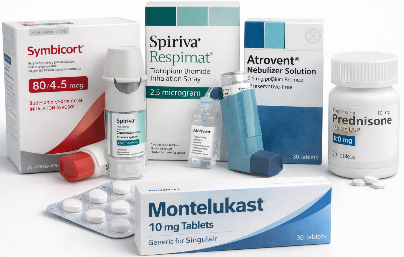1.Symbicort 200/6 Turbuhaler(generic-#12 units) 2.Albuterol Inhaler 100mcg/200 doses(#5 units) 3. Spiriva 18 mcg inhaler(generic#4 units) 4. Montelukast 10mg (#360 tabs) 5.Prednisone 20mg (#100 tabs) 6. Spacer(#1 adult,#1 child) 7. Atrovent Nebulizer Soln(2 box)