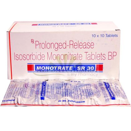 Monotrate SR 30mg What is Isosorbide Mononitrate? Isosorbide Mononitrate belongs to a family of drugs called nitrates. It dilates (widens) blood vessels, paving a clear passage for the blood to flow easily thereby helping the heart to pump blood easier. It is prescribed mainly to prevent angina attacks (chest pain). However, it will not treat an angina attack that has already begun. This medication may also be prescribed for other conditions not listed here.Isosorbide Mononitrate is sold under various drugs, some of which are Isosorb Mono, Ismo (made by ESP Pharma Inc.), and Imdur (made by Schering Corporation). Important Information about Isosorbide Mononitrate Avoid taking Isosorbide Mononitrate if you are taking Sildenafil (Viagra, Revatio, or others). Taking both these medications at the same time can lead to serious, life threatening side effects. Also avoid Isosorbide Mononitrate if you are allergic to it, isosorbide diMononitrate, or nitroglycerin, or if you have early signs of a heart attack (chest pain or heavy feeling, pain spreading to the arm or shoulder, nausea, sweating, or general ill feeling).Prior to taking Isosorbide Mononitrate, inform your doctor if you have congestive heart failure, low blood pressure, or kidney disease. This medicine can cause severe headaches initially when you start taking it. These headaches may gradually become mild as you continue to take this medicine. Consult your doctor if you need a headache medicine. Do not stop taking Isosorbide Mononitrate suddenly. Doing so may increase the chance of an angina attack. Use this medicine regularly to prevent an angina attack.Isosorbide Mononitrate is an FDA pregnancy C drug. It is not known whether it can harm an unborn baby if taken during pregnancy. Notify your doctor if you are pregnant or plan to become pregnant while taking this medicine. It is also not known whether Isosorbide Mononitrate can pass into breast milk and harm a nursing baby. It is better to ask your doctor if it is safe to take this medicine if you are breast feeding. Before taking Isosorbide Mononitrate Before taking Isosorbide Mononitrate (Isosorb Mono, Ismo, Imdur), take care of all precautions mentioned above. Discuss them with your doctor and clear all doubts which you may have about this drug. How should I take Isosorbide Mononitrate? Take Isosorbide Mononitrate (Isosorb Mono, Ismo, Imdur) strictly according to your doctor’s direction or according to the instructions on the medication label. Do not alter the dosage unless your doctor advises you to do so. Also, do not take this medication after the prescribed period is over. All medications come with a patient leaflet. Refer the instructions in them for detailed information on that particular medication. Always store this medicine in a cool and dry place.Drink plenty of fluids while taking Isosorbide Mononitrate to avoid dehydration. Watch out for causes of low blood pressure such as diarrhea, vomiting, heavy sweating, dialysis, low salt diet, or taking diuretics. What if I miss a dose? If you miss a dose of Isosorbide Mononitrate, take it as soon as you remember. Don’t take the missed dose if the time to take the next dose is almost up. Taking multiple doses near to each other can lead to excess medication in your body which can be harmful. What if I overdose? In case of an overdose of Isosorbide Mononitrate, get emergency medical attention or call the Doctor immediately. Things and Activities to avoid while taking Isosorbide Mononitrate Isosorbide Mononitrate can impact your thinking and reflexes. Be extra careful if you drive or do other activities that require a high degree of mental awareness. This medicine can make you dizzy. Avoid getting up suddenly from sitting or lying position. Also avoid alcohol. Isosorbide Mononitrate Side Effects Some side effects of Isosorbide Mononitrate are headache, dizziness, light headedness, nausea, and fluishing. If any of these conditions persist or deteriorate, or if you experience any serious side effect, stop using this medicine and contact your doctor right away. The side effects mentioned above are not the only ones that you may experience or witness due to Isosorbide Mononitrate. If you get any serious side effects due to this medication, contact your doctor right away. Isosorbide Mononitrate Dosing Information Isosorbide Mononitrate dosage may depend on a range of factors like age, sex, drug allergies, or seriousness of the condition among several other factors. Your dosage will be determined by your doctor after examining you properly. Remember to follow your doctor’s advice properly for best results. Interaction with other drugs Some drugs can interact with Isosorbide Mononitrate. These are some of the interacting drugs: blood pressure medicines, dihydroergotamine, ergotamine, Tadalafil, Vardenafil, beta blocker drugs (Atenolol, carvedilol, labetalol, metoprolol, or others), or heart disease medicines. These are not the only drugs that can interact with Isosorbide Mononitrate. There may be others. Let your doctor know about every other medicine which you may be using. Never start a new medication without taking proper medical advice.