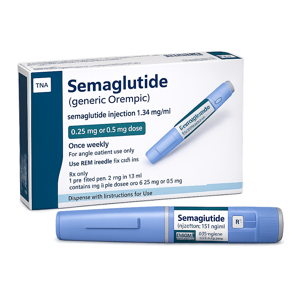 Semaglutide is a prescription injectable GLP-1 medication used to support blood sugar control in adults with type 2 diabetes and reduce cardiovascular risk. Generic formulation. Not for use in type 1 diabetes or individuals under 18.